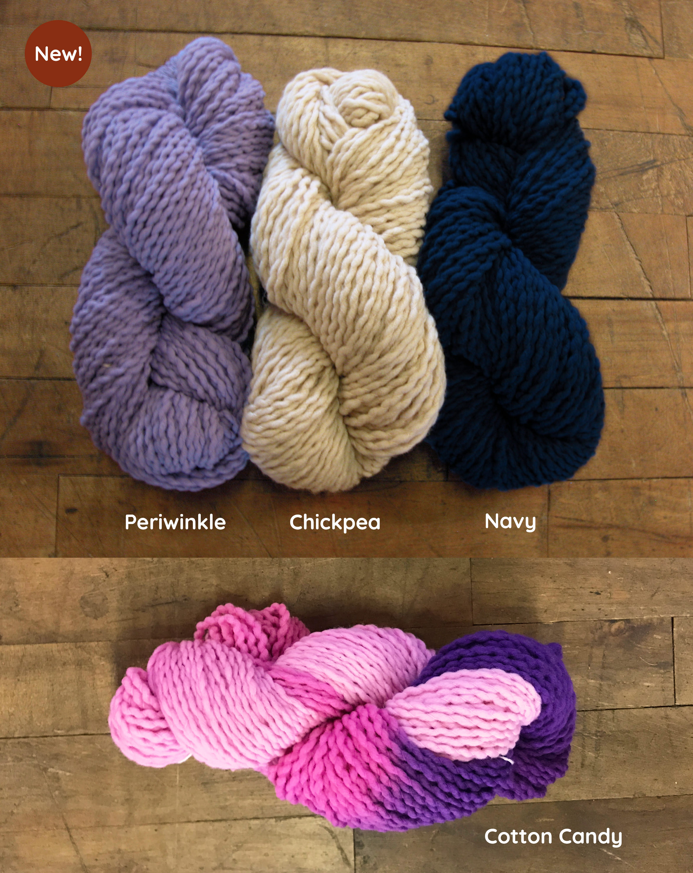 In our American Lamb line, we have 4 new colors: Navy, Periwinkle, Chickpea, and Cotton Candy.