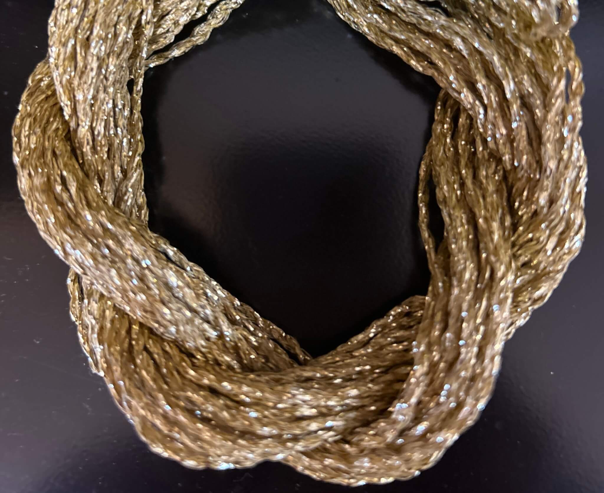 This Metallic yarn is twisted like a chain effect – Great for knitting, and weaving. This yarn is great for adding glitzy accents to your projects, or use it alone for eveningwear. Knit a sparkly vest or shrug to wear with your favorite dress! Also great for accessories, like headbands or skinny scarves.